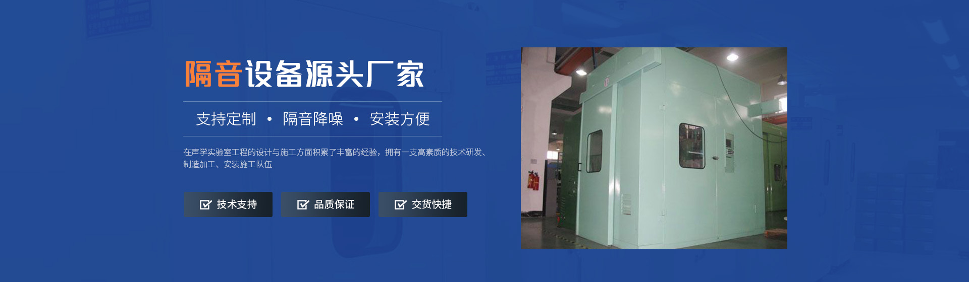 林昇環(huán)保在聲學(xué)實(shí)驗(yàn)室工程的設(shè)計(jì)與施工方面積累了豐富的經(jīng)驗(yàn),擁有一支高素質(zhì)的技術(shù)研發(fā)、制造加工、安裝施工隊(duì)伍。提供現(xiàn)場測量踏勘、噪聲數(shù)據(jù)分析、方案設(shè)計(jì)、生產(chǎn)加工、施工安裝、儀器設(shè)備等一系列全方位服務(wù)。